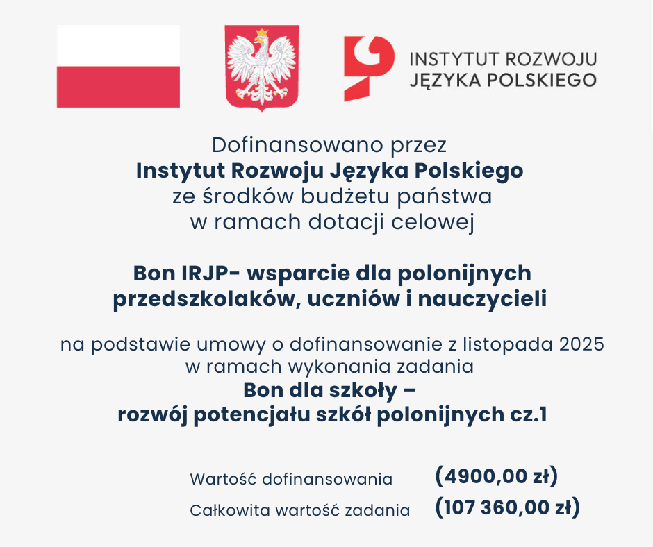 Dofinansowano przez Instytut Rozwoju Języka Polskiego ze środków budżetu państwa w ramach dotacji celowej na podstawie umowy o dofinansowanie z dnia 27.06.2025 w ramach wykonania zadania „Dofinansowanie dla szkół polskich w Wielkiej Brytanii” .